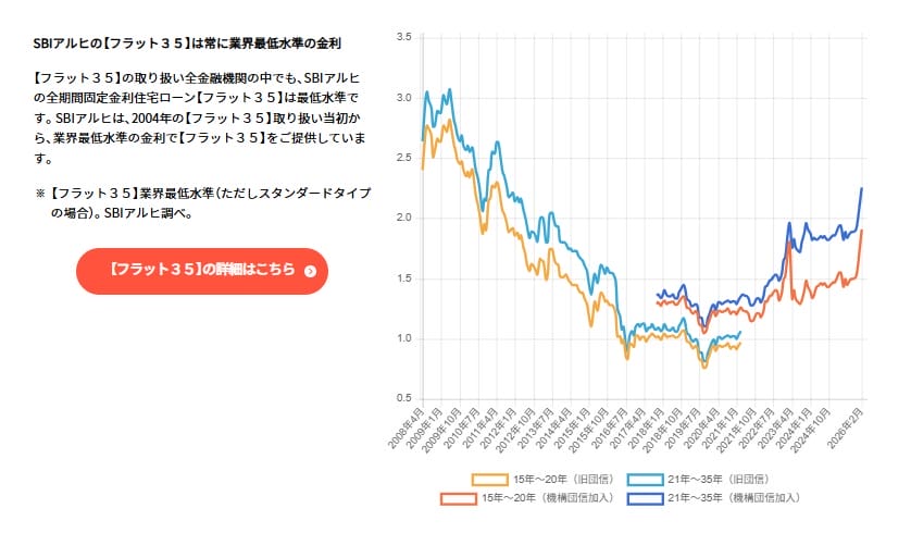 住信SBIネット銀行の「フラット35」も楽天銀行やアルヒと同様に毎月非常に魅力的な水準の金利を提示しています。